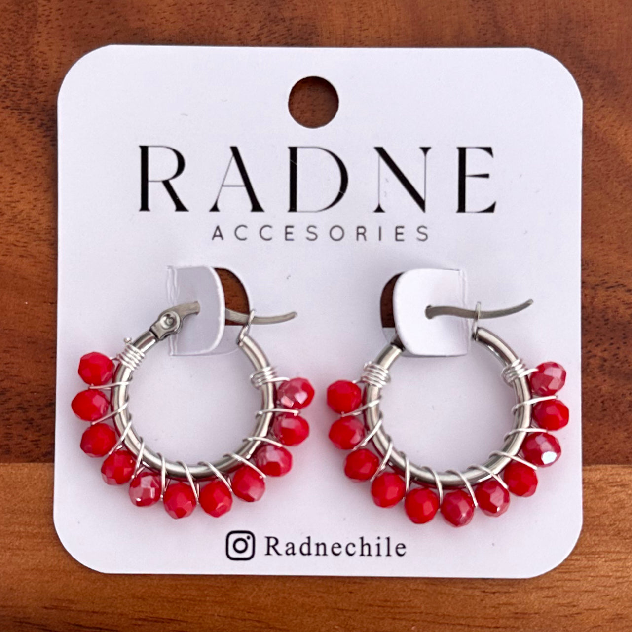 Aros cristales color rojo. Argollas de acero inoxidable, hipoalergénicos. Miden 2 cm.