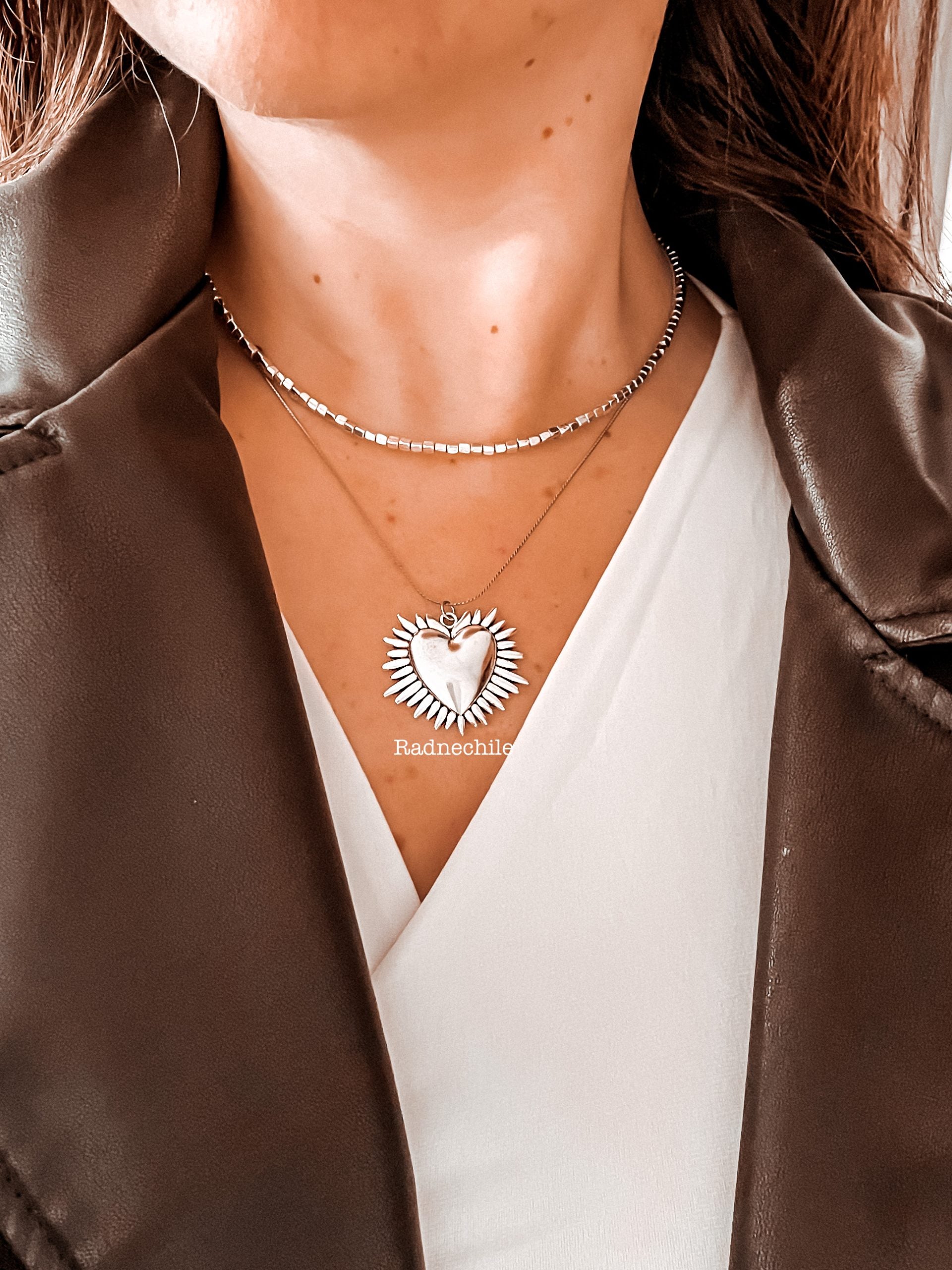 2 collares. El mas corto mide 50 cm con extencion, aluminio. El mas largo, el collar corazón, es cadena de acero, hipoalergenico y colgante aluminio, mide 50 cm.