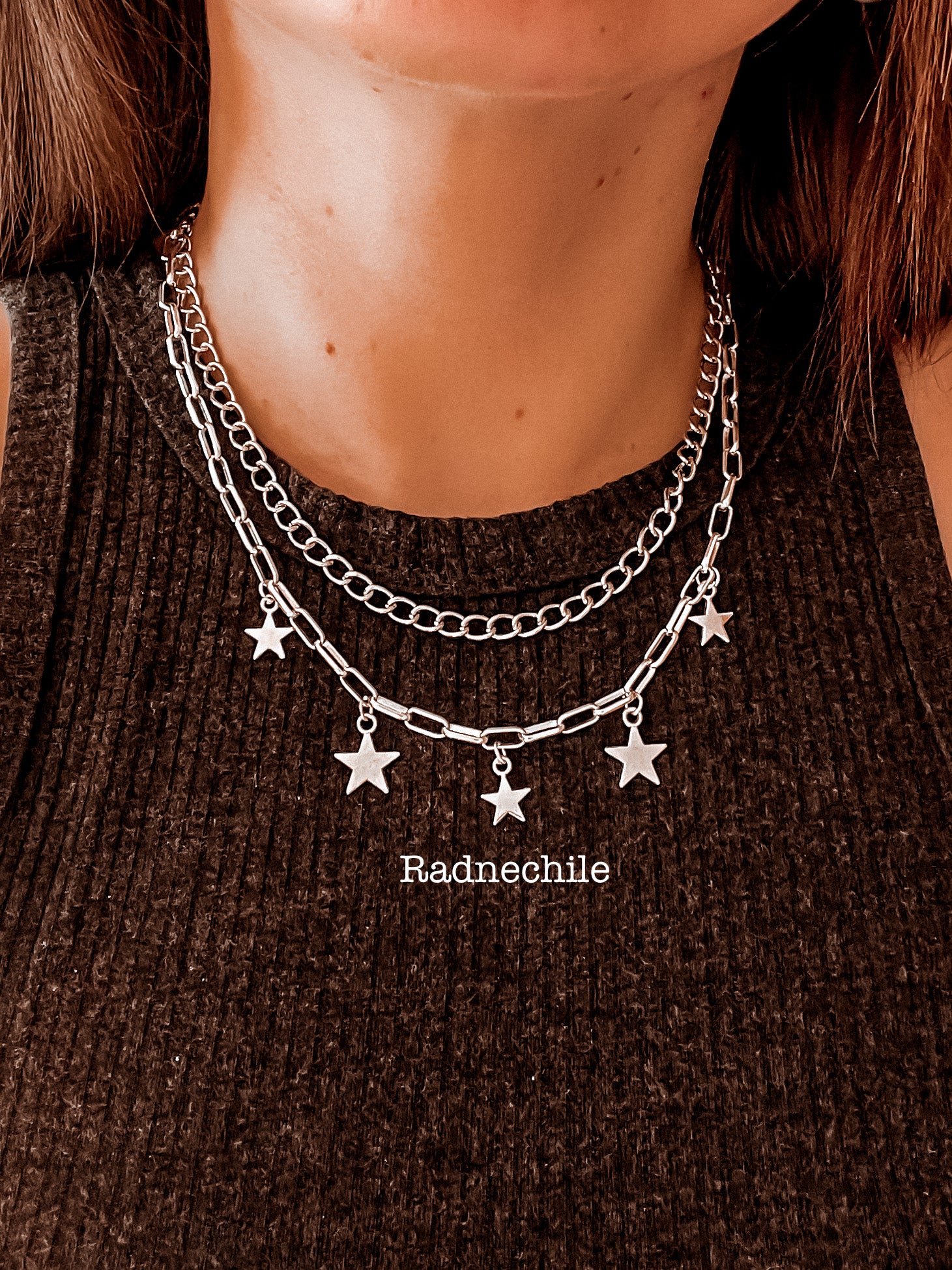 2 collares. El mas corto mide 40 cm con extensión, aluminio. El mas largo de estrellas, mide 45 cm con extensión, aluminio.